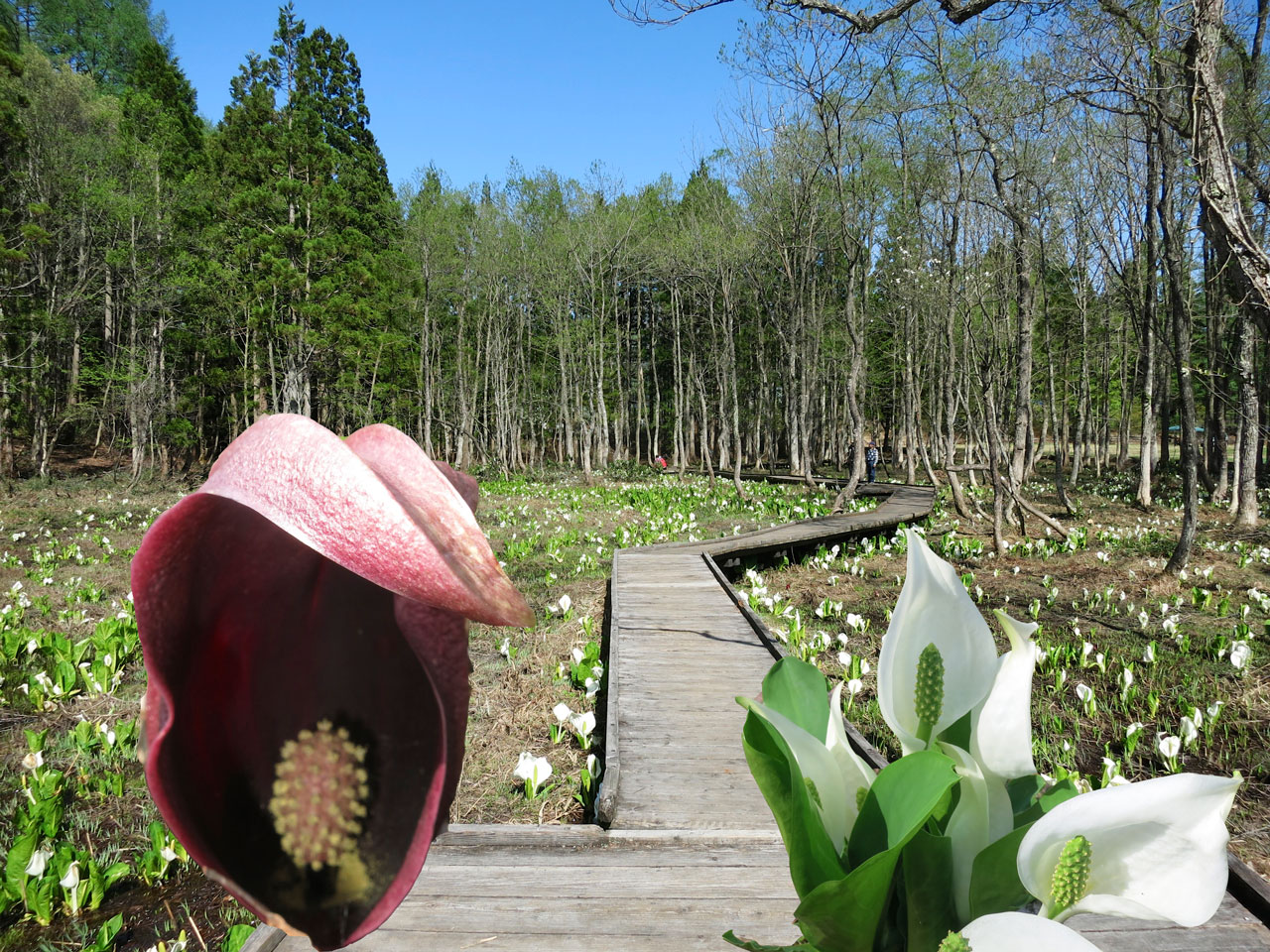 この連休中には更に家族が増えて、今日は4人で白馬方面をドライブしました。写真は白馬村と小谷村との境にある落倉(おちくら)自然園の風景です。隣りの栂池高原にはよく行くのですが、手前のこの自然園には初めて立ち寄りました。この時期、遊歩道からは綺麗に咲きほころんだ水芭蕉が見頃でした。戸隠、奥社の水芭蕉よりも花が一回り大きく、可憐と言うよりも迫力ある咲きっぷりでした。座禅草もあって、うつむいた赤い花弁は今まで遠くから見たことはあるのですが、中まで覗き見できたのは今回、初めてでした。この花、昆虫を中に取り込んで食べてしまうのだそうです。おお、怖〜。どこへ行っても人出の多い連休ですが、ここは人もまばらで静かに散策できました。まさに自然の佇まいです。